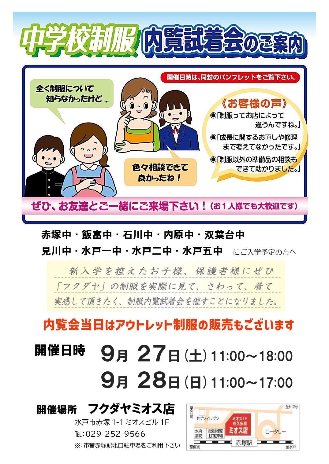 水戸市内の小中学校制服・体操服などの学校用品を取り扱っています。